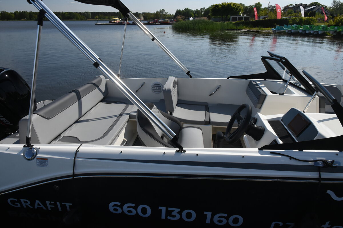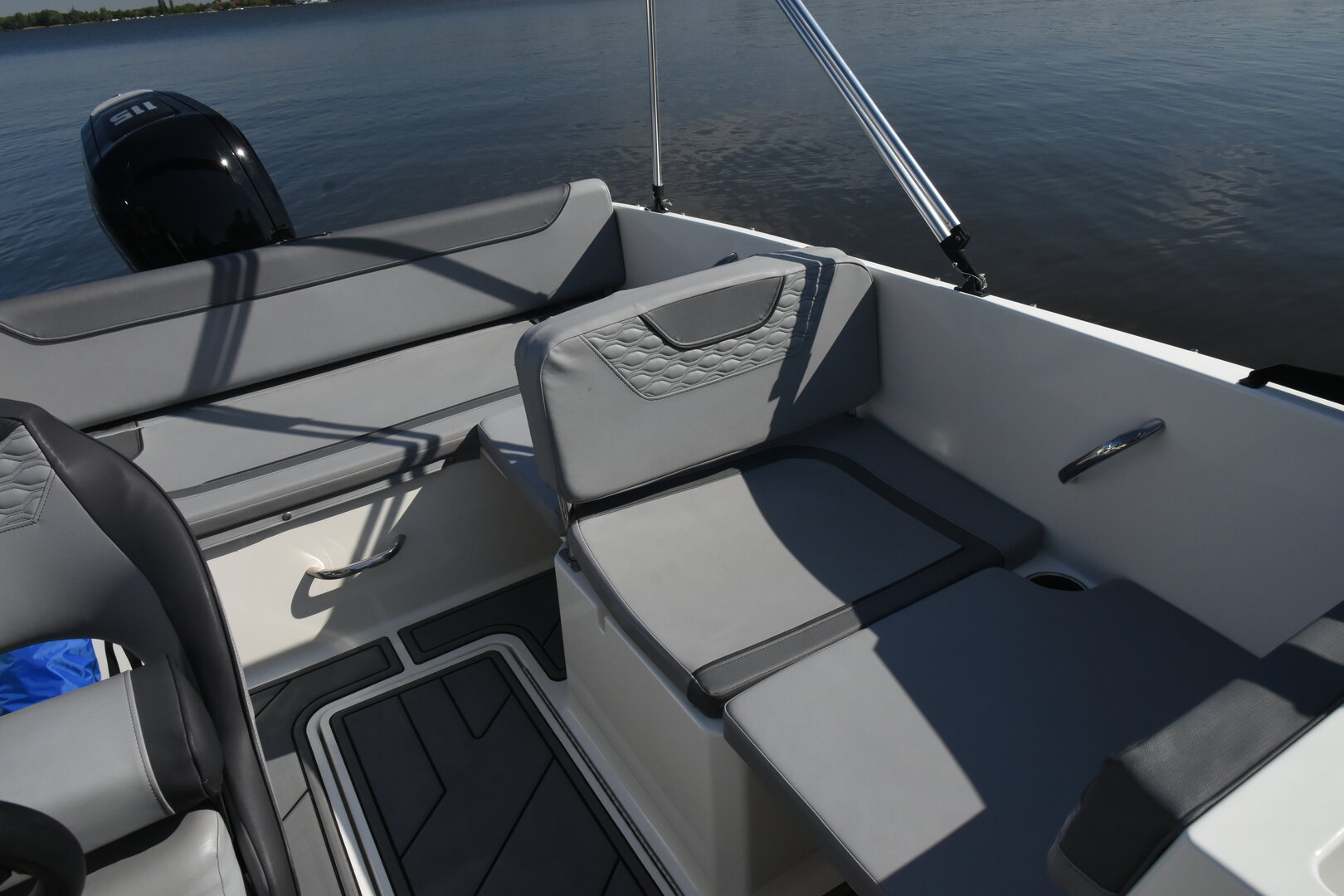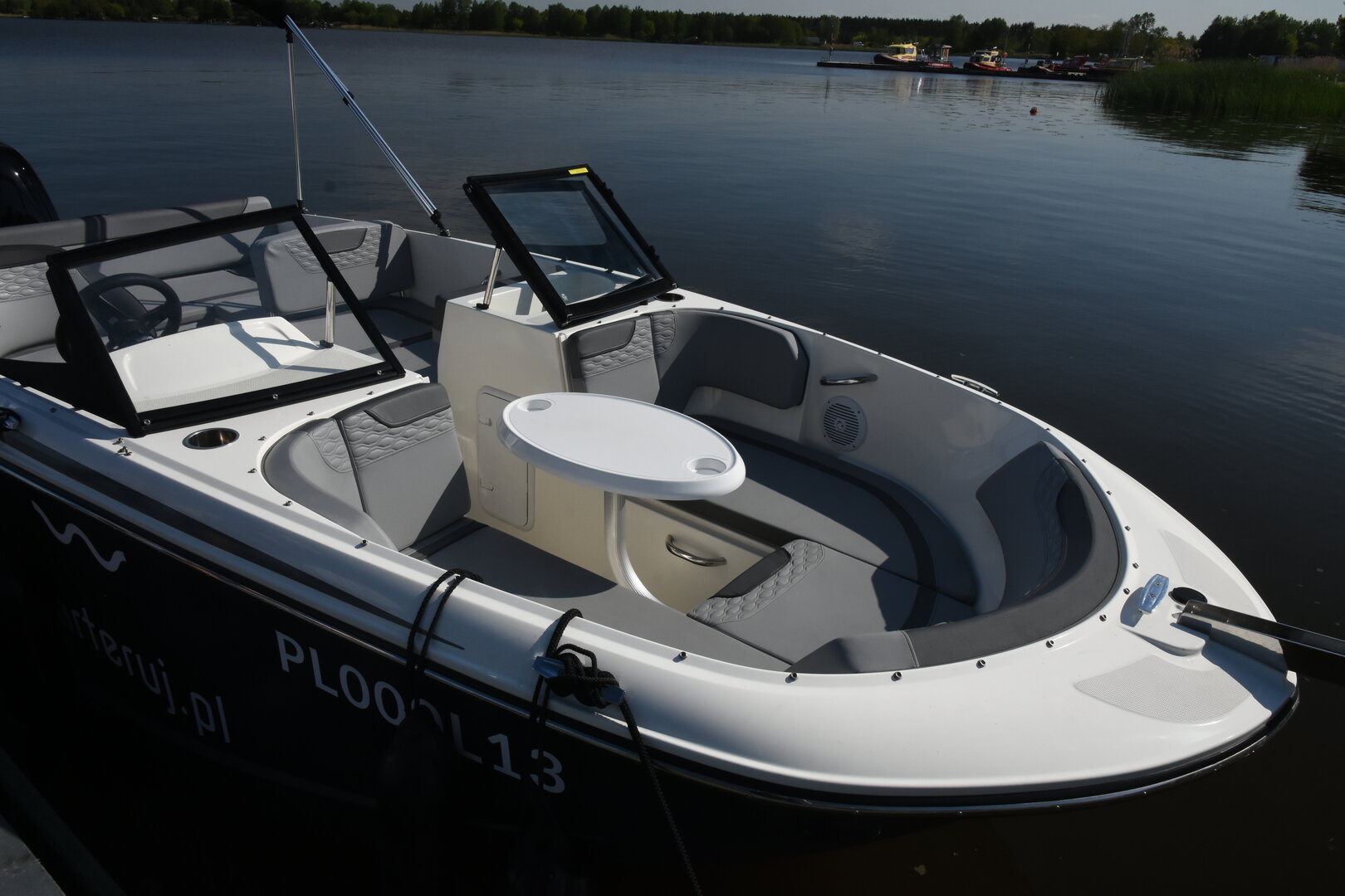 Zacznijmy od tego, co widać od razu: przestrzeń. Dzięki charakterystycznemu kształtowi dna w przekroju litery M, pokład jest wyjątkowo szeroki i stabilny — mieści wygodnie aż 8 osób. Część pasażerów może się rozłożyć na sundecku z przodu i cieszyć się słońcem, podczas gdy inni chowają się za owiewką. Do dyspozycji masz też składany stolik i bimini chroniące przed słońcem — wszystko, czego potrzebujesz na długi, leniwy dzień na jeziorze.