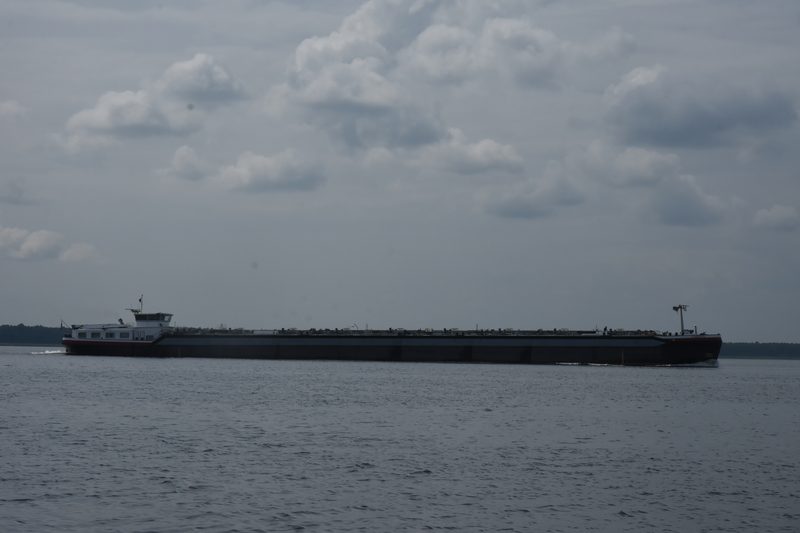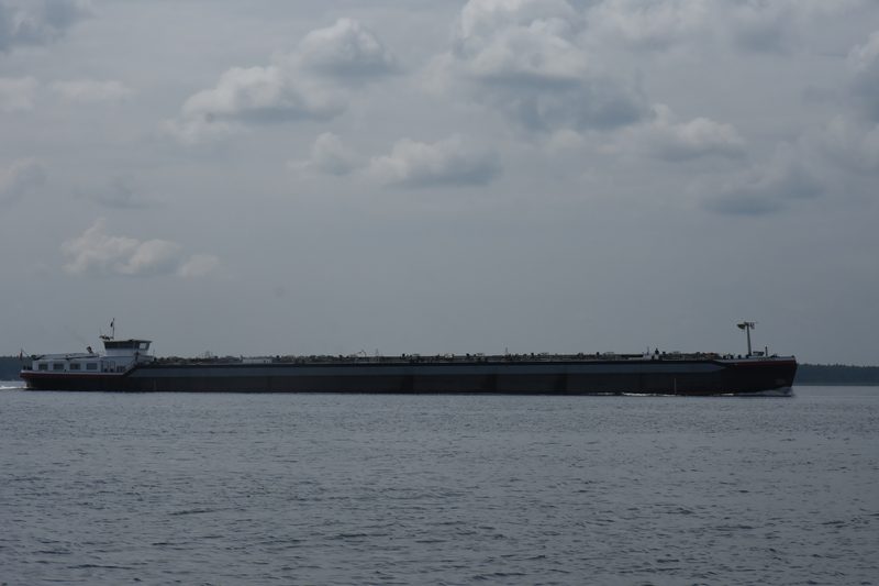Na szlaku spotkaliśmy kilka dużych jednostek — kontenerowce i barki płynące torem wodnym Szczecin–Świnoujście. Na wodzie obowiązuje prosta zasada: duże statki mają zawsze pierwszeństwo. My trzymaliśmy się krawędzi szlaku i przepuszczaliśmy je z bezpiecznej odległości.