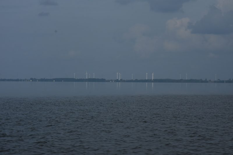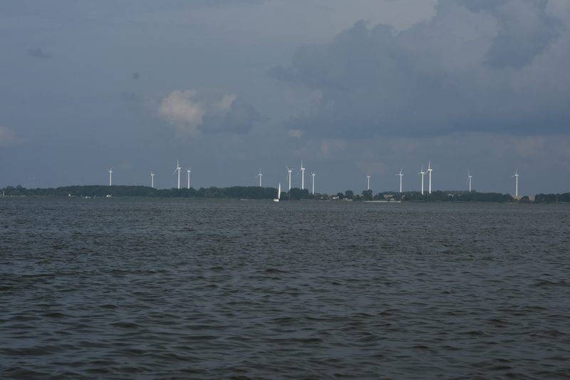 Na odcinku od Wolina do Zalewu Kamieńskiego widoczne były współczesne wiatraki — stojące daleko na lądzie, ale tak wysokie, że z wody dało się je bez trudu dostrzec. Z perspektywy łódki wyglądają jak olbrzymy na horyzoncie — ciekawy kontrast z sielskim krajobrazem zalewu.