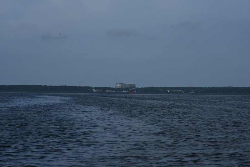 Wracaliśmy tą samą trasą. Pogoda się nie zmieniła — niebo wciąż zasnute, więc zachodu słońca tego dnia nie było nam dane zobaczyć. Za to spokojnie i ciepło. Na Zalewie Kamieńskim woda była już delikatnie rozbujana, ale przy odpowiedniej prędkości nie stanowiło to problemu.