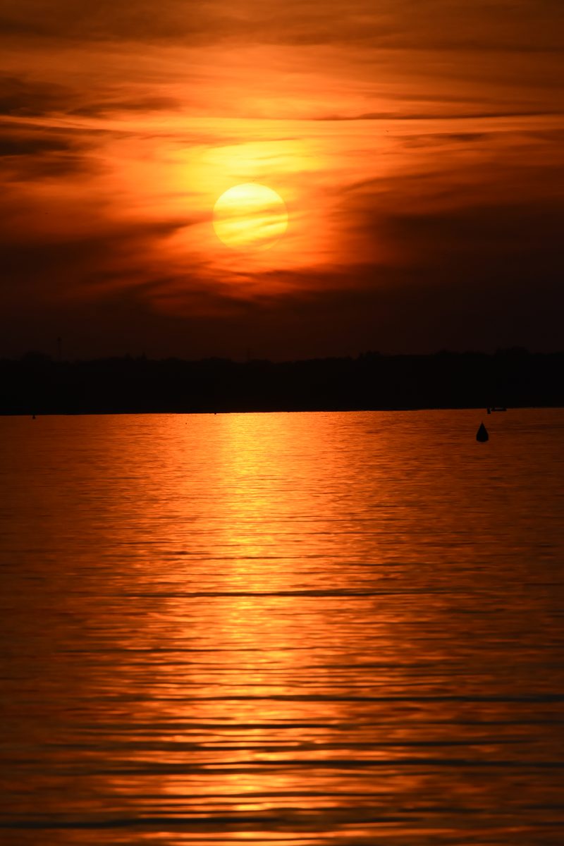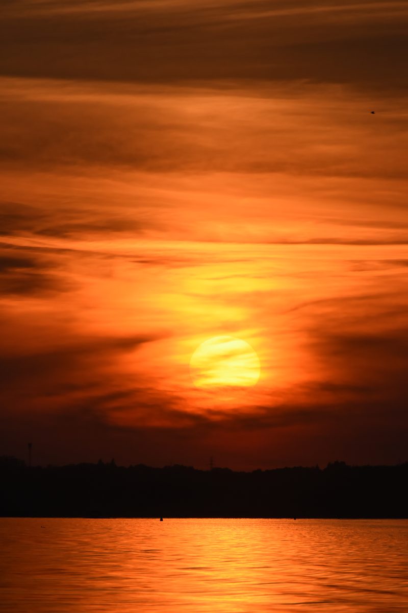 Sekret? Odpowiedni moment i teleobiektyw. Gdy słońce zaczęło schodzić ku horyzontowi, światło zmieniało się ze złotego w głęboki amber, a potem w kaskadę różów i fioletów, które wydawały się niemal zbyt żywe, żeby być prawdziwe. Teleobiektyw przybliżył słońce, kompresując atmosferę i nasycając każdy kolor — scena wyglądała niemal surrealistycznie.
