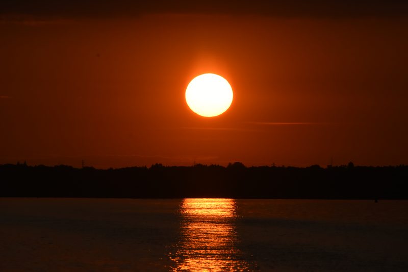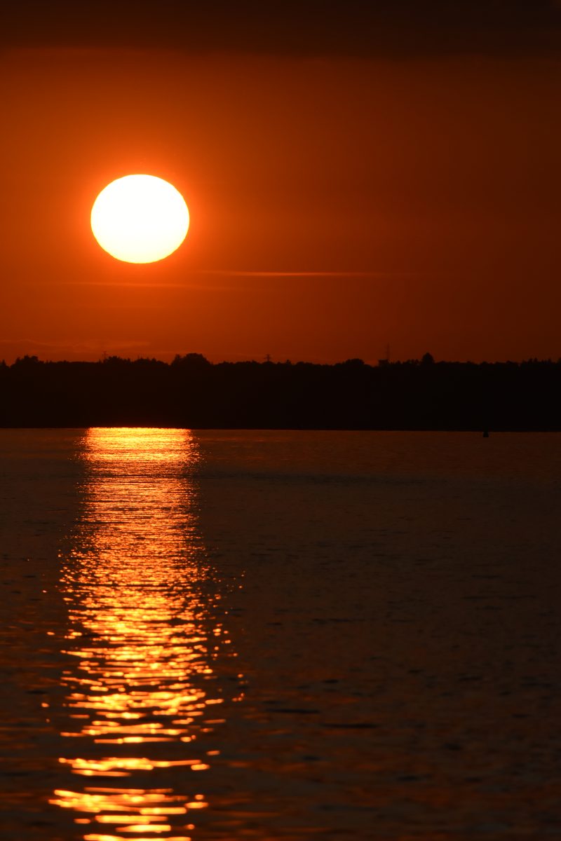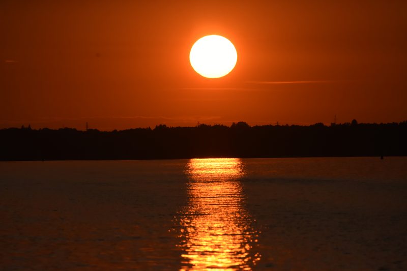 Gdy słońce zbliżało się do zachodniego brzegu, niebo rozbłysło w odcieniach bursztynu, koralu i głębokiej róży — jeden z tych lipcowych zachodów, przy których najpierw sięgasz po aparat, a potem po prostu odkładasz go i patrzysz. Światło rozlało się po wodzie długimi złotymi smugami, a sylwetka warszawskich wieżowców odcinała się wyraźnie od rozjarzonego horyzontu.